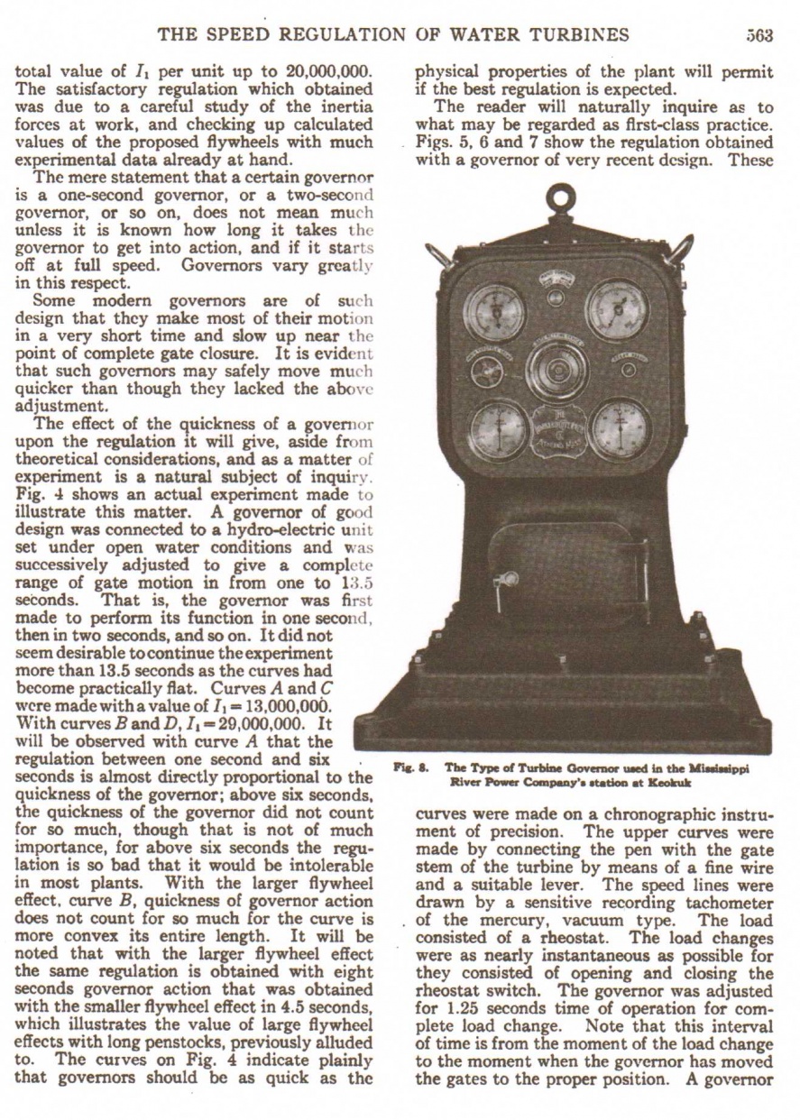 History of the speed regulation of hydro-electric turbines.