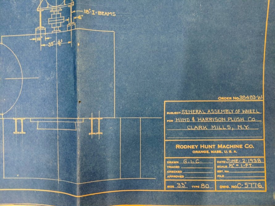 RODNEY HUNT MACHINE COMPANY. ASSEMBLY OF TURBINE WHEEL. DRAWN ON JUNE 2, 1938. DRAWING NUMBER C-5776..