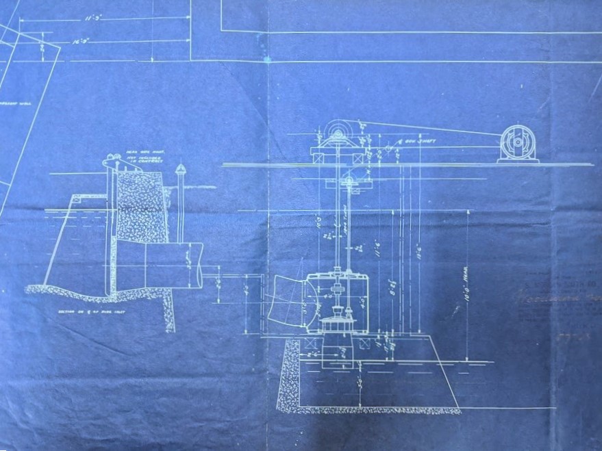 Closeup of turbine water wheel. Blueprint from S. Morgan Smith, York, Penna. Yorklyn, Delaware Hydroelectric turbine water wheel installation. March 26, 1919.