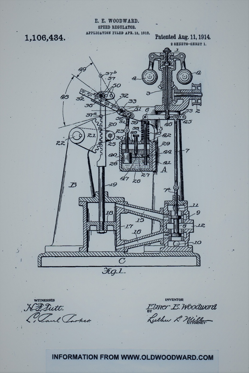 Elmer Woodward's hydraulic governor patent number 1,106,434.